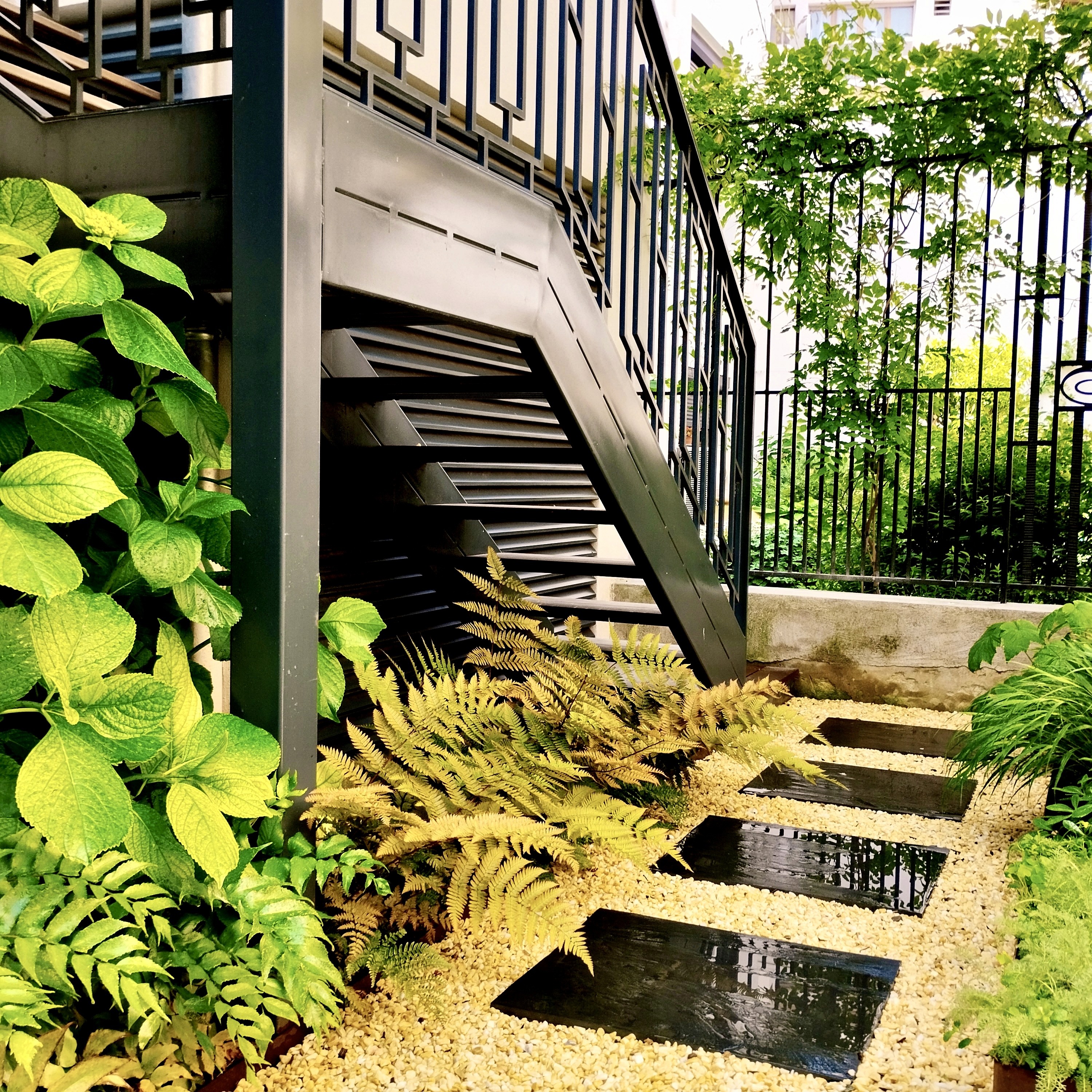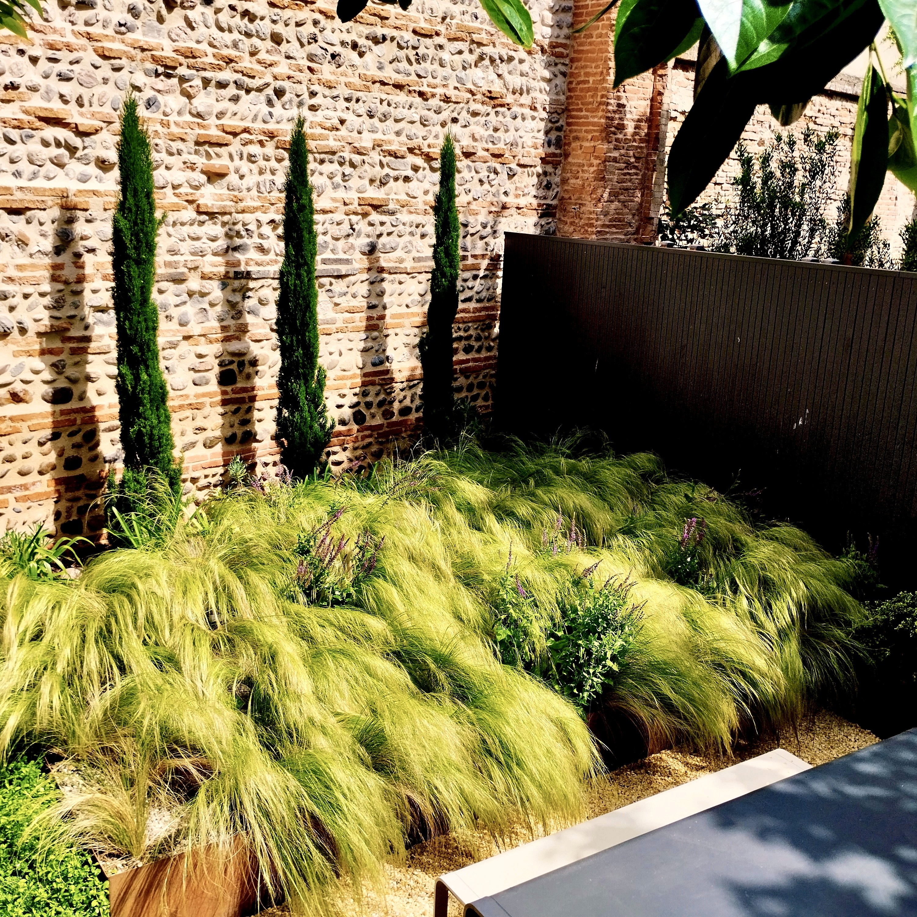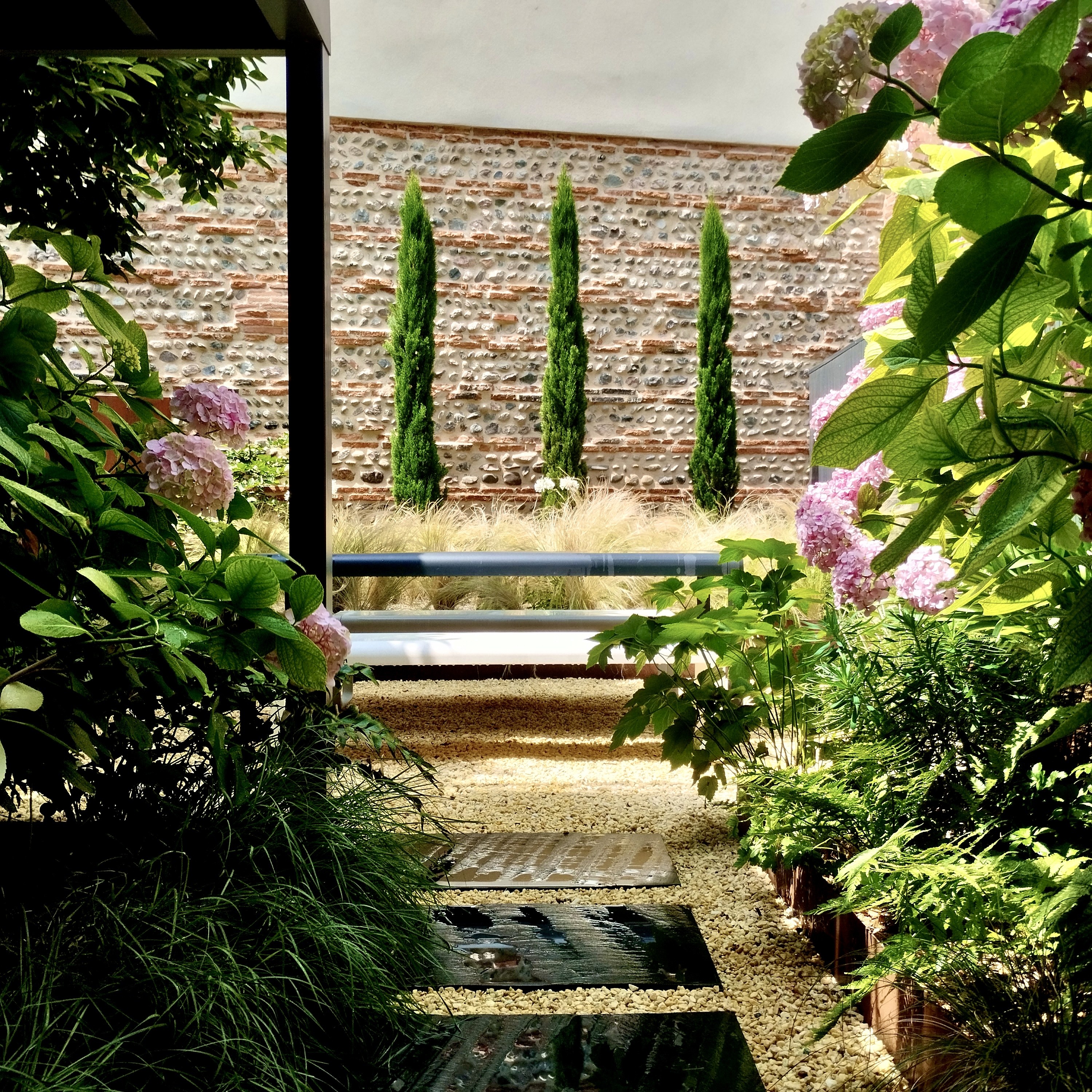 Un jardin urbain de 60m² structuré par l’architecture et le végétal. La composition associe trame minérale, structure métallique et strates plantées pour organiser l’espace et créer une lecture claire du lieu. Le projet prolonge l’architecture existante par un paysage précis, sobre et évolutif.
