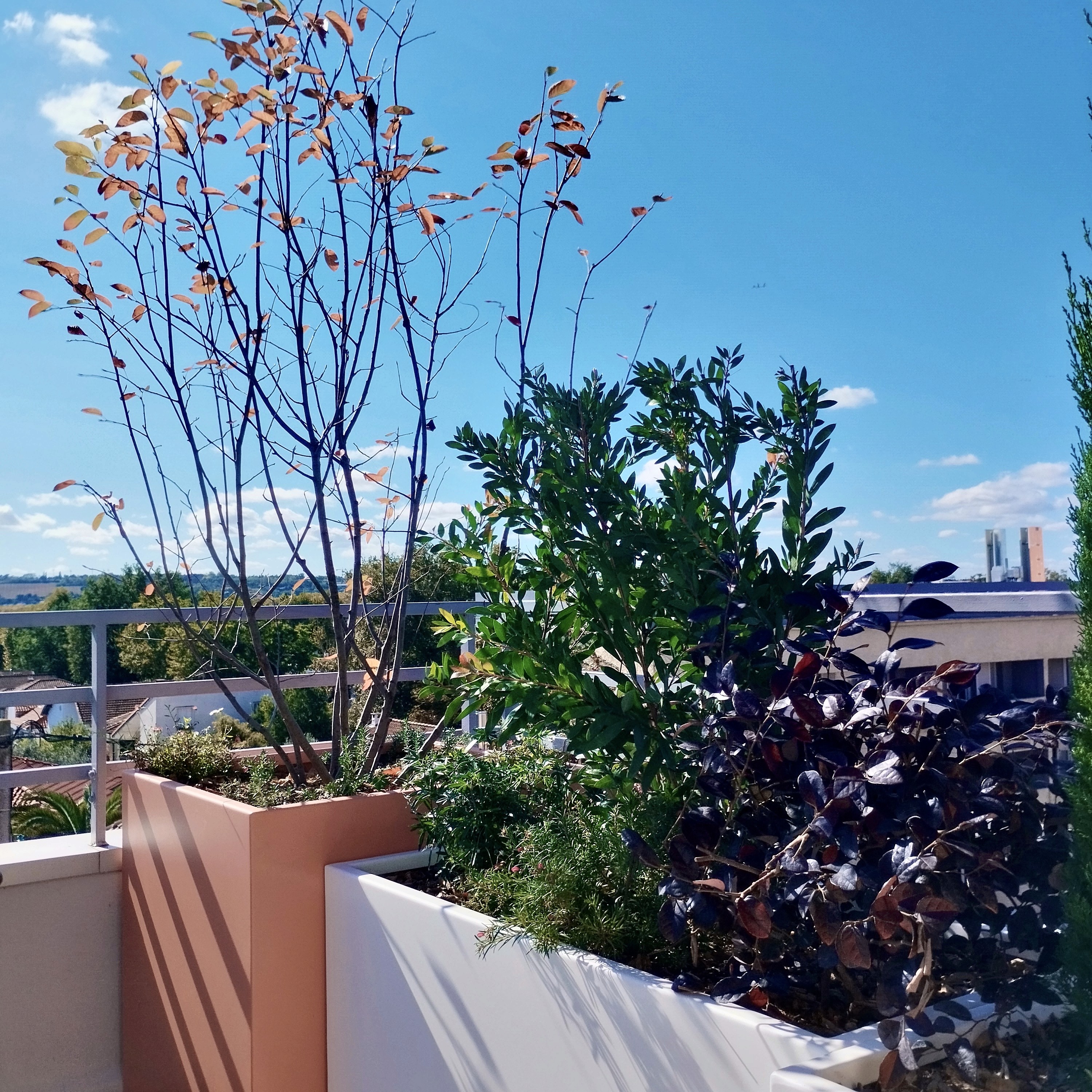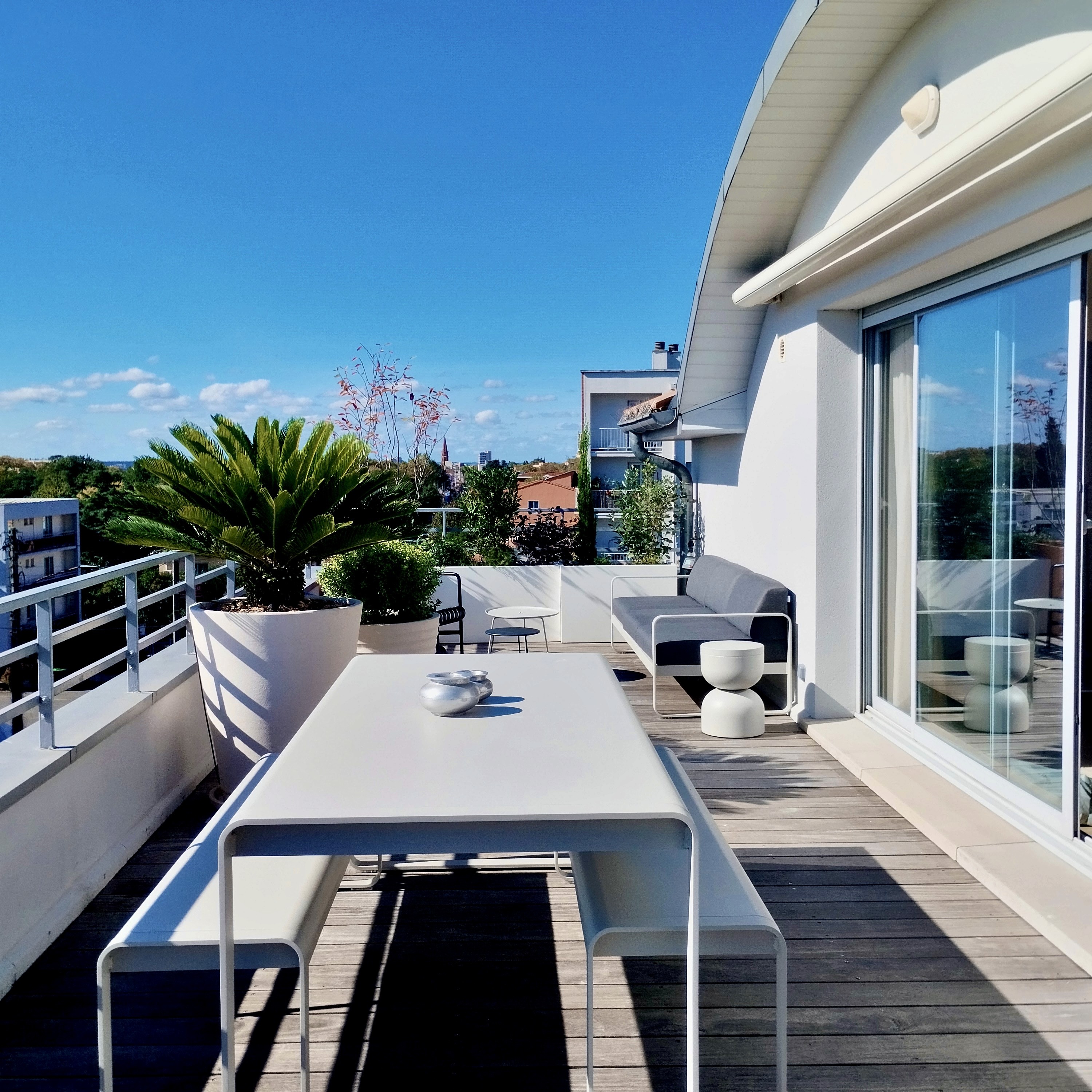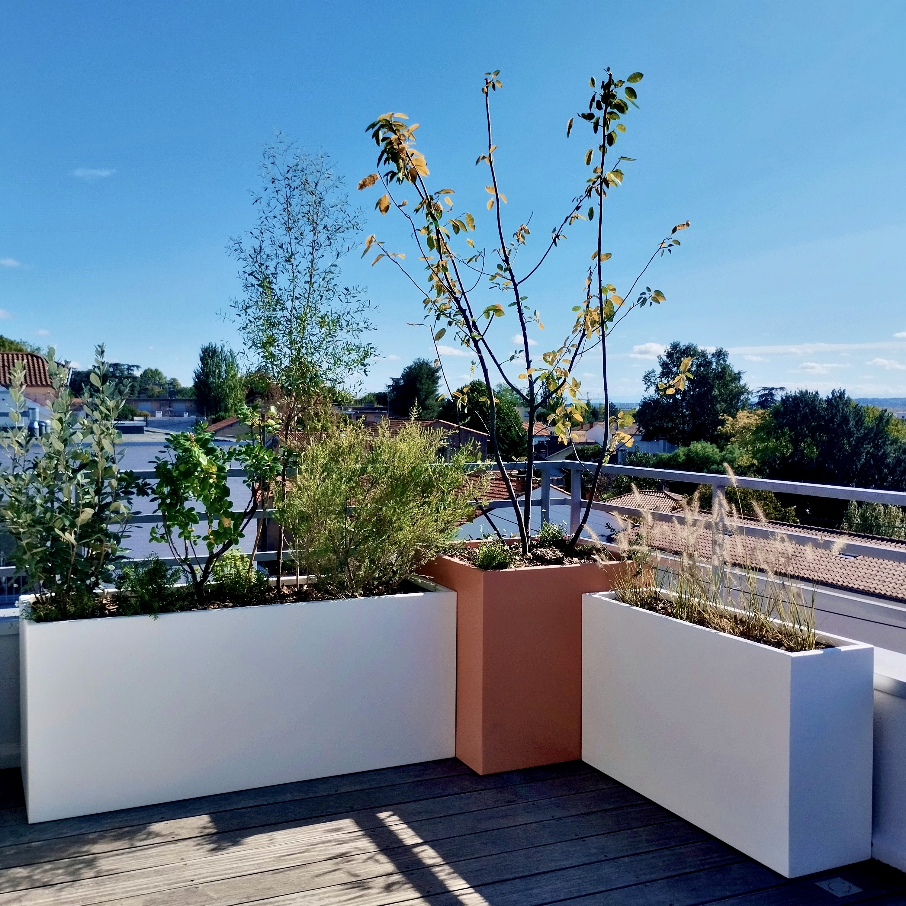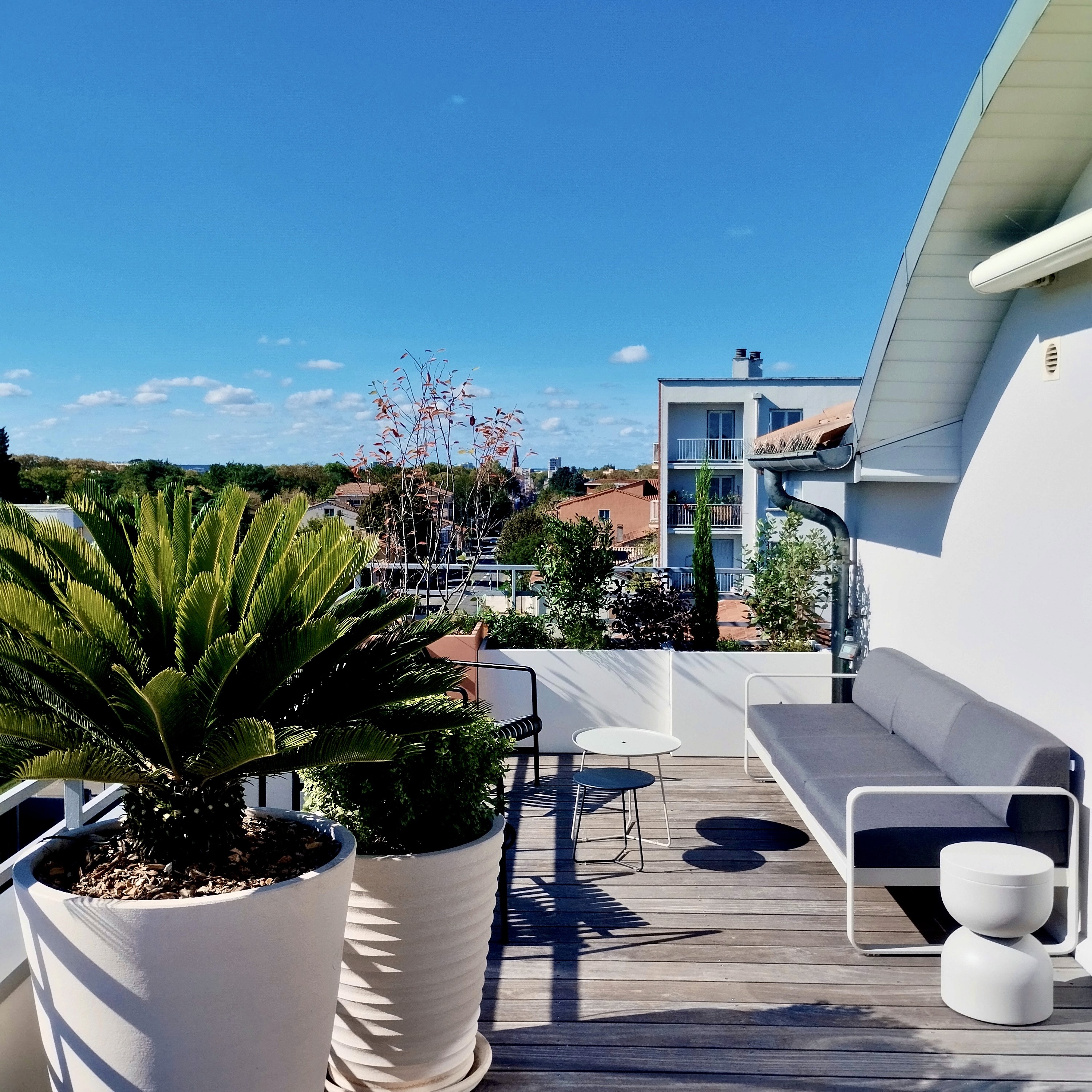 Terrasse de 40 m² en dernier étage, exposée au vent et au soleil. De grands bacs plantés composent des filtres protecteurs, masquent les vis-à-vis et accueillent une palette méditerranéenne, sobre et écologique, adaptée au climat toulousain.