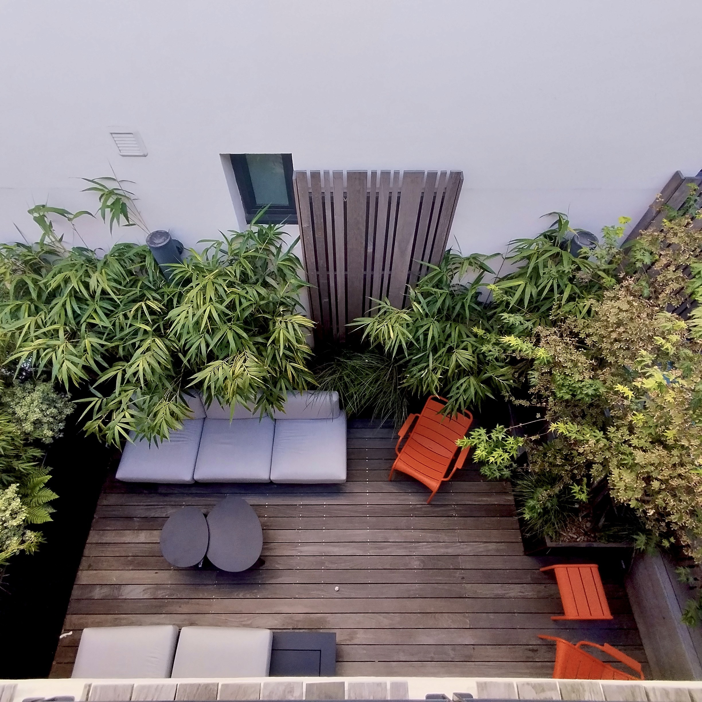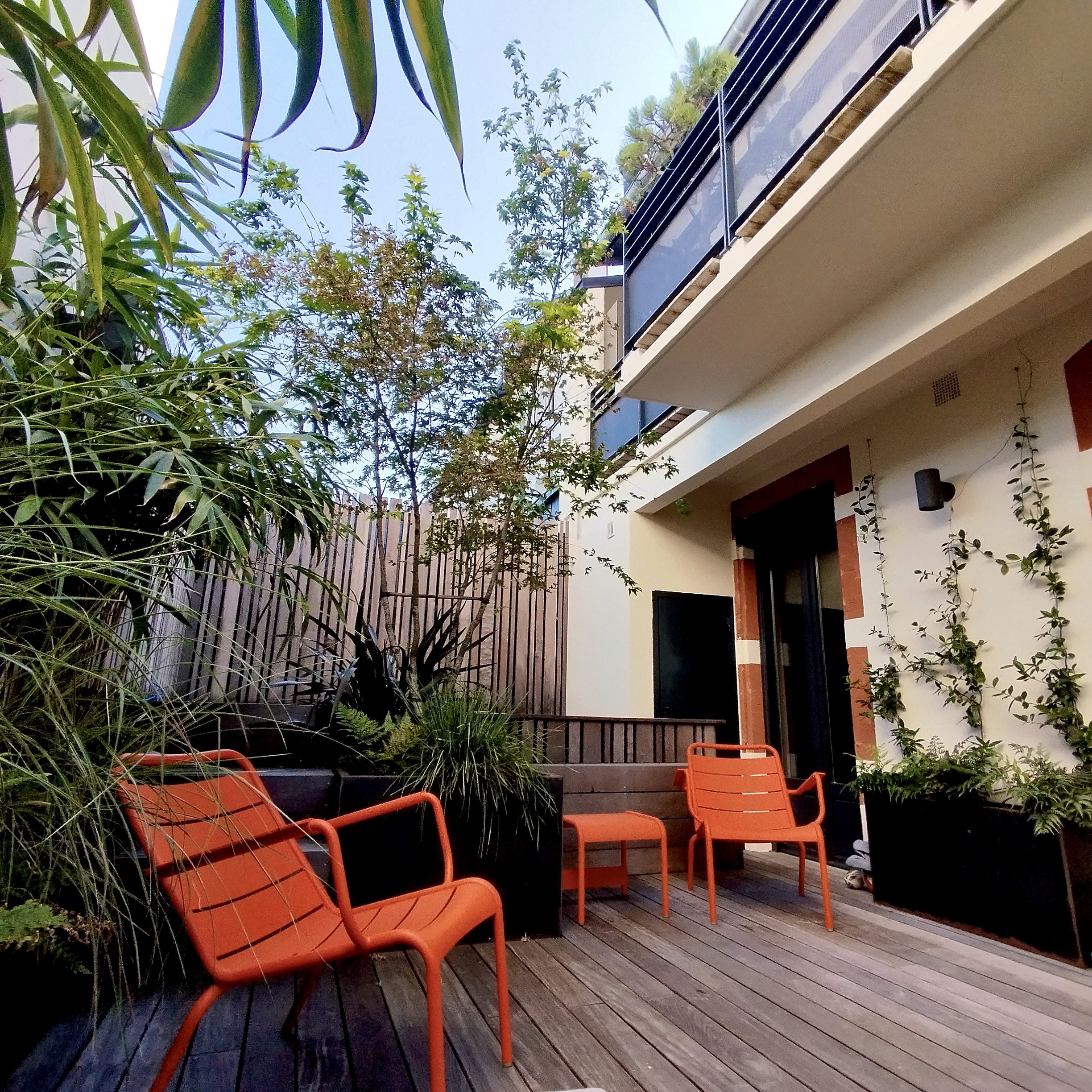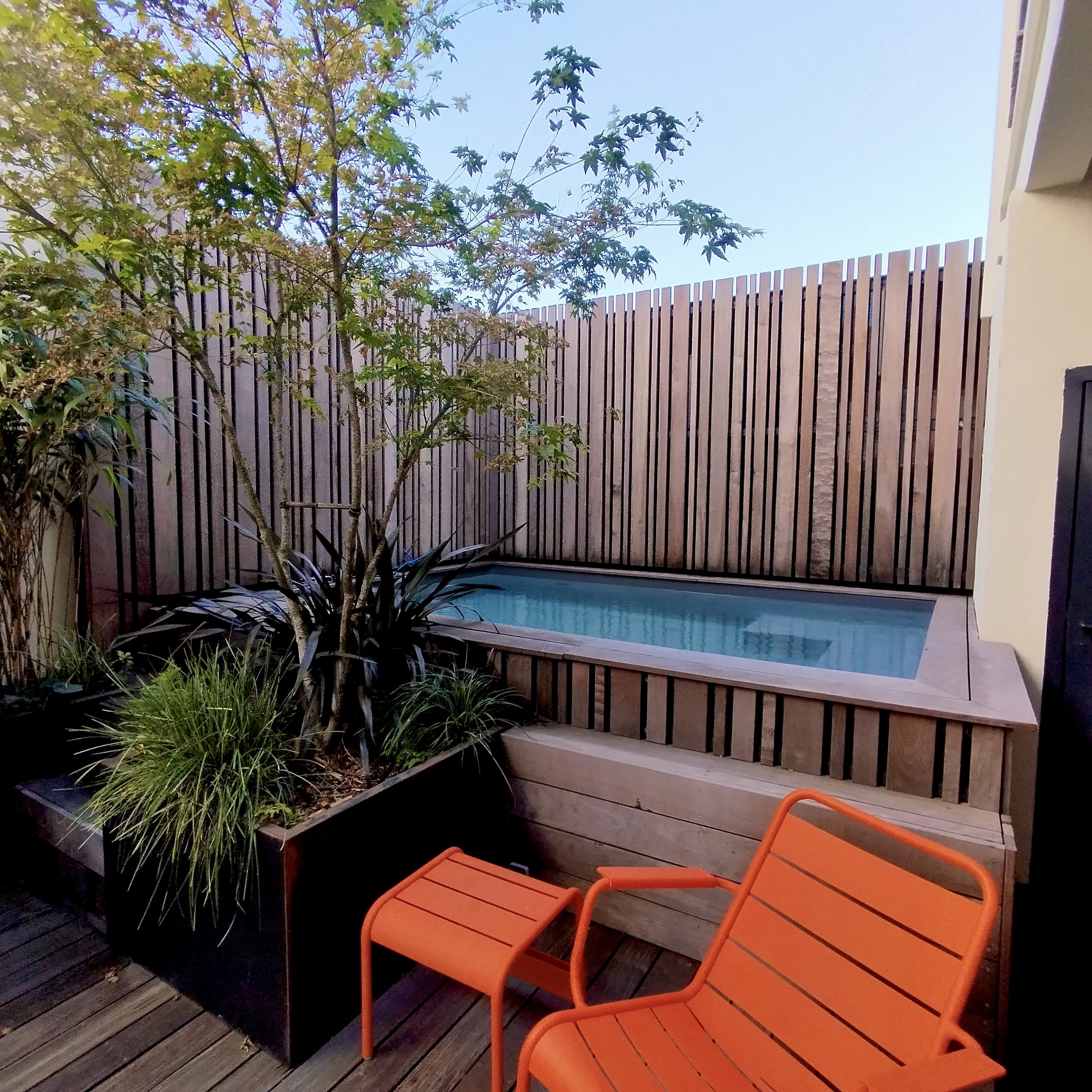 Terrasse de 35m² avec piscine pensée comme un espace de vie structuré. Lignes claires, matières naturelles et végétation choisie composent un jardin minimaliste, durable et apaisé, conçu comme une continuité entre architecture, paysage et usages.